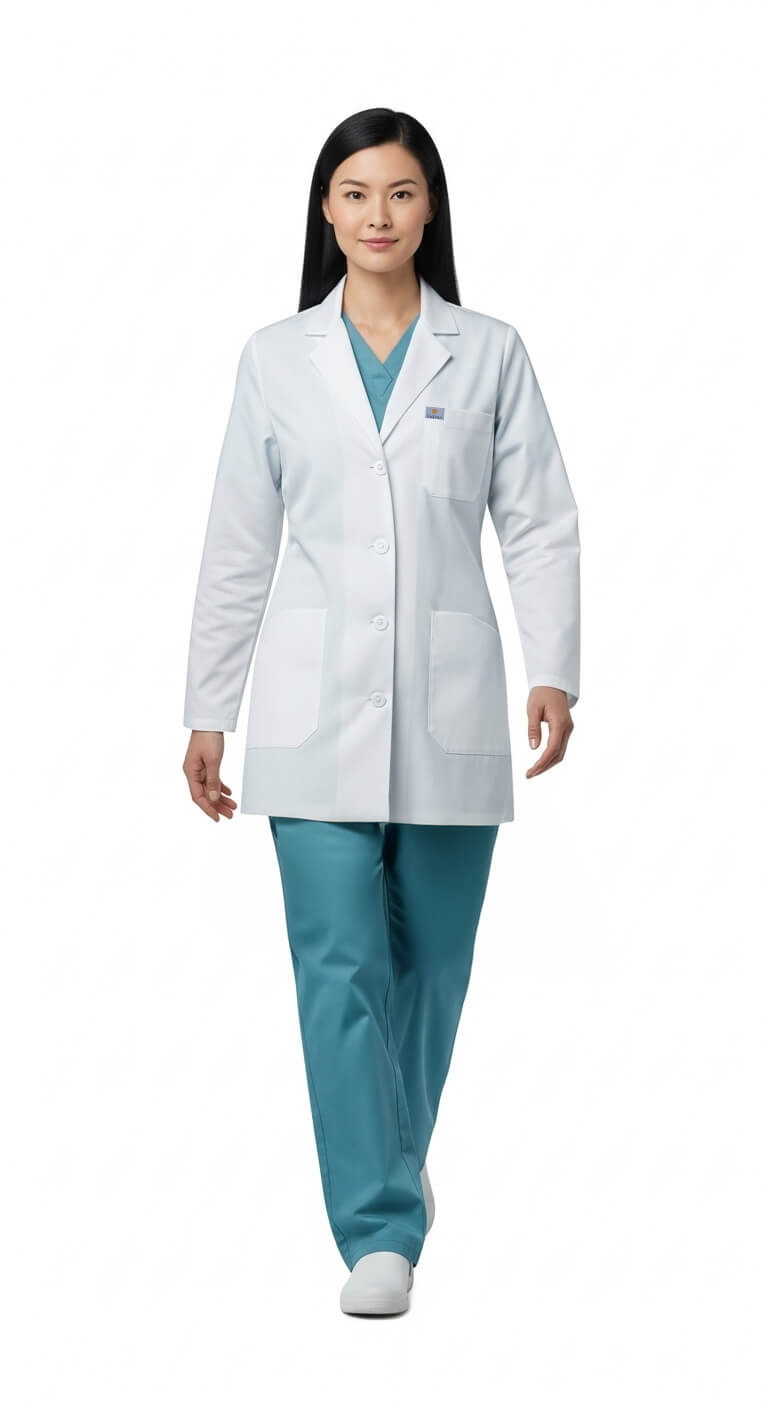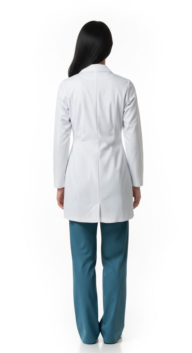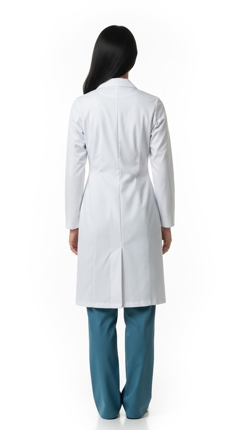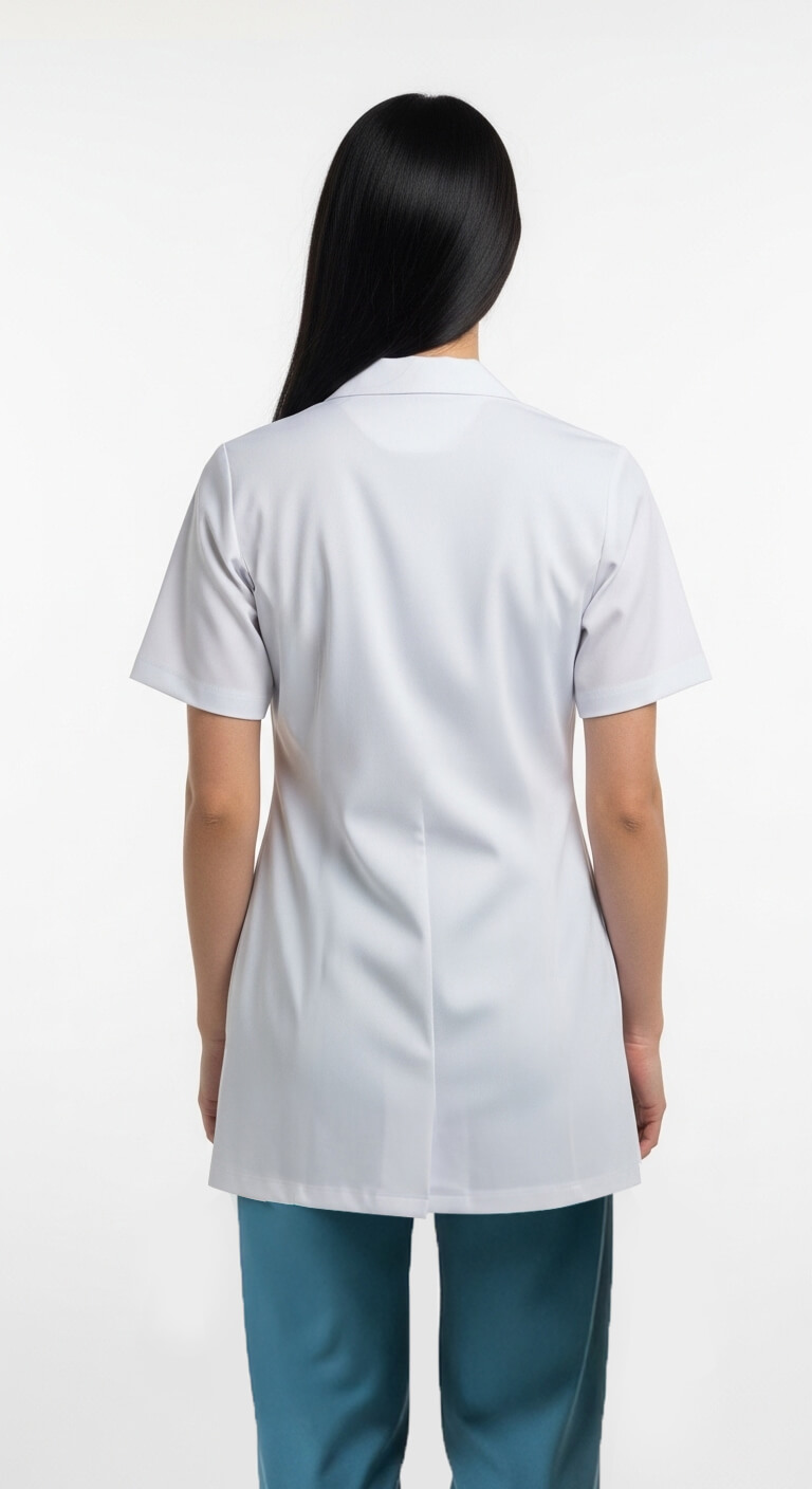 * Long white doctor's coat for women, made from premium polycotton fabric.